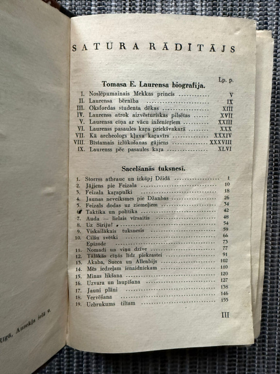| Grāmata “Sacelšanās tuksnesī” (Tomass E. Laurenss) ir latviešu tulkojums no T. E. Lawrence darba, kas saīsinātā veidā balstīts uz viņa slaveno grāmatu “Seven Pillars of Wisdom”. Tā apraksta Arābu sacelšanos pret Osmaņu impēriju Pirmā pasaules kara laikā (1916–1918), kur Laurenss kā britu virsnieks un diplomāts organizēja arābu spēku apvienošanos un veiksmīgas militārās operācijas. | |