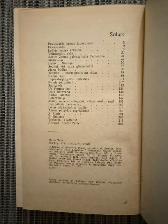 “Septiņi vīri pingvīnu vidū” ir Mario Marē dokumentāls stāsts par Francijas polārekspedīciju uz Antarktīdu 1950. gadu sākumā. Grāmata atklāj pētnieku ikdienu, sadzīvi un zinātniskos novērojumus Adeles zemē, īpašu uzmanību veltot imperatorpingvīnu dzīves ciklam. Autors ar humoru un sirsnību apraksta dzīvi kolonijā, kur pētnieki kļūst par daļu no pingvīnu sabiedrības. | |