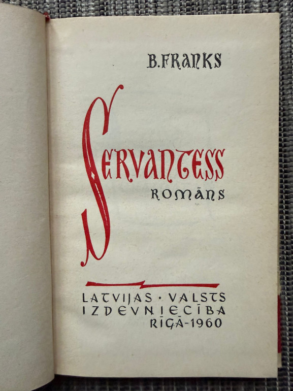 | "Servantess" ir Bruno Franka vēsturisks romāns par spāņu rakstnieka Migela de Servantesa dzīvi. Tajā attēloti viņa piedzīvojumi kā kareivim, gūsteknim un nodokļu iekasētājam, kā arī viņa ceļš uz literāro slavu ar romānu Don Kihots. Grāmata izgaismo Servantesa personību un laikmetu, kurā tapa viņa nemirstīgais darbs. Ir ieraksts | |