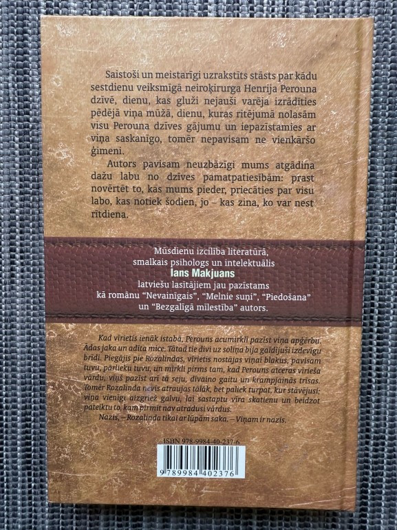 | Iana Makjuana romāns "Sestdiena" ir intensīvs un psiholoģiski niansēts stāsts par vienu dienu neiroķirurga Henrija Perouna dzīvē. Šī diena, kas varēja kļūt par viņa pēdējo, atklāj viņa attiecības ar ģimeni, dzīves vērtības un negaidītus pavērsienus. Romāns aicina novērtēt ikdienas mirkļus un to, kas mums patiesi pieder. | |