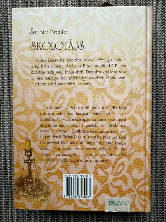 | Grāmata “Skolotājs” (Šarlote Brontē) ir romāns, kas stāsta par Viljamu Kriemsu – jaunu angli, kurš dodas uz Briseli, lai strādātu par skolotāju internātskolā. Darbs atklāj viņa intelektuālās ambīcijas, vientulību, kaislības un sarežģītas attiecības ar kolēģiem, īpaši ar direktori un skolotāju Polīnu. Romāns ir introspektīvs, pilns psiholoģisku niansējumu un kultūras kontrastu. | |