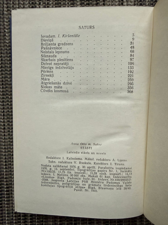 | Stāstu un noveļu krājums, kurā Anna Sakse atklāj cilvēku attiecības, morāles dilemmās un laikmeta noskaņu. Raksturīgs psiholoģisks dziļums, reālisms un uzsvars uz cilvēcību un ētiskām vērtībām. | |