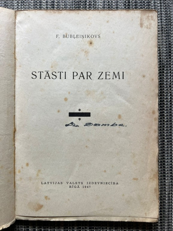 | Stāsti par zemi – F. Bubļeiņikovs, Latvijas Valsts Izdevniecība, 1947, 149 lpp. Populārzinātniska grāmata par Zemes uzbūvi, dabas parādībām un ģeoloģiju, papildināta ar ilustrācijām. Vērtīgs izdevums lasītājiem, kas interesējas par zinātni un dabas noslēpumiem. | |