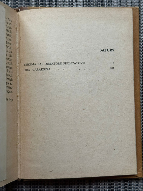 | “Teiksma par direktoru Prončatovu” ir stāsts par Tagaras spļavkontores galveno inženieri Oļegu Prončatovu, kurš pēc direktora nāves tiecas pārņemt vadību; darbs risina līderības, “racionālā egoisma” un attiecību ar partijas funkcionāriem jautājumus (sižetā iekļauti “skaidi” jeb epizodes no varoņa dzīves). “Lida Varaksina” ir poveste par jaunu kluba vadītāju Sibīrijas ciemā pie Čulimas upes; | |