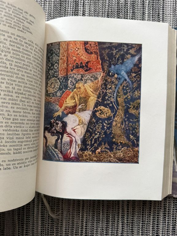 | Klasisku Tuvo Austrumu pasaku izlase ar Šeherezādes stāstījuma rāmi; latviski R. Krodera tulkojumā, ar Aleksandra Apsīša mākslinieciskām ilustrācijām. 1957. gada LVI izdevums ir grezni noformēts un vēlāk kalpojis par pamatu faksimilam. | |