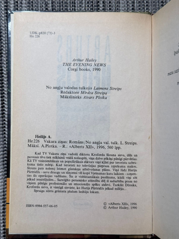 | Grāmata “Vakara ziņas” ir spraigs mediju trilleris par TV diktoru Krofordu Slounu, kura ģimeni nolaupa teroristi; viņš, neuzticoties tīkla vadībai un izmeklētājiem, pats dodas bīstamā glābšanas misijā. Aizkulišu skats uz televīzijas ziņu industriju, ētikas dilemmām un reitingu spēlēm. | |