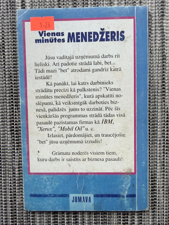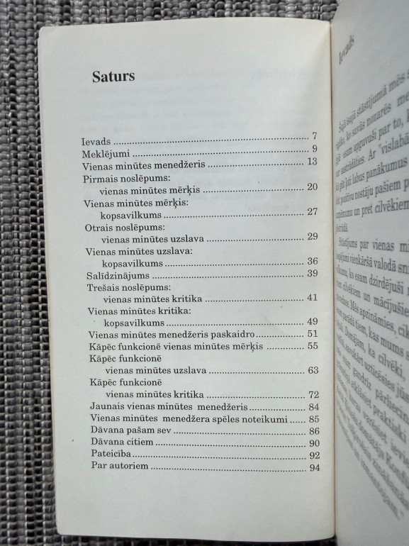 | Klasisks vadības ceļvedis, kas māca, kā ar vienkāršām, efektīvām metodēm vadīt cilvēkus un sasniegt rezultātus. Autors piedāvā trīs galvenos principus – vienas minūtes mērķi, uzslavas un rājienus –, lai uzlabotu produktivitāti, motivāciju un komunikāciju. Piemērota vadītājiem un ikvienam, kas strādā ar cilvēkiem. | |