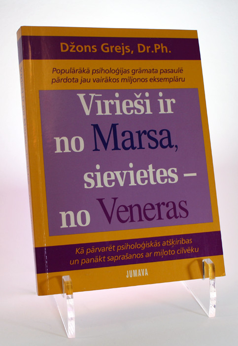 | Amerikāņu psihologa Džona Greja grāmata “Vīrieši ir no Marsa, sievietes - no Veneras” skaidro atšķirības starp vīriešu un sieviešu domāšanu, jūtām un uzvedību. Autors piedāvā saprotamus un noderīgus padomus, kā veidot saskanīgas attiecības, labāk izprast partneri un stiprināt savstarpējo saprašanos. Pasaulē populārs ceļvedis harmoniskām attiecībām. | |