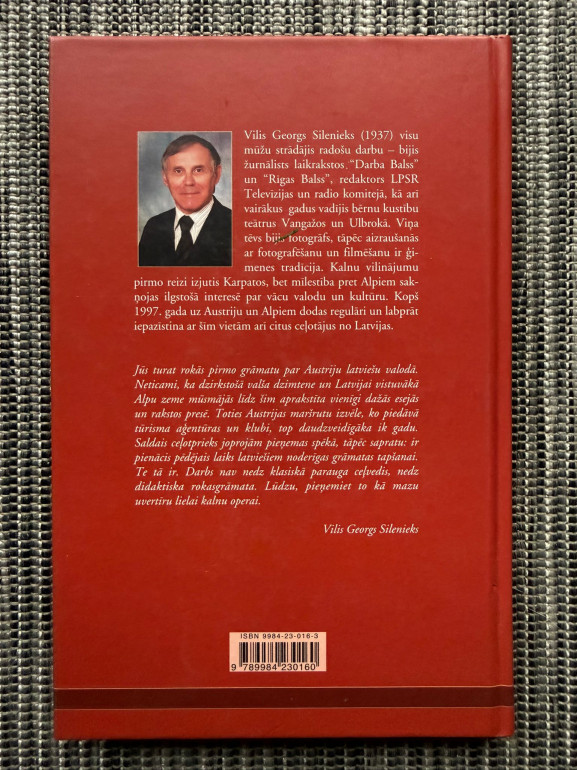 | Latviešu lasītājam rakstīts ceļvedis par Austrijas Alpiem—tradīcijas, sadzīve un daudz krāsainu fotogrāfiju; sērija “Vēju roze”. Vilis Georgs Silenieks ved pa maršrutiem Lejasaustrijā, Augšaustrijā, Zalcburgas zemē un Tirolē—labs starts pirmajam kalnu braucienam. | |