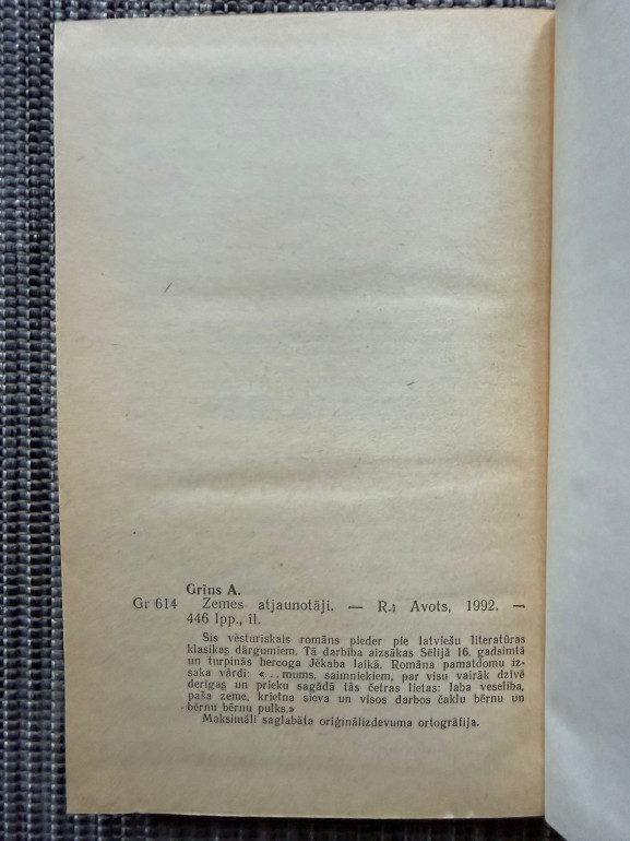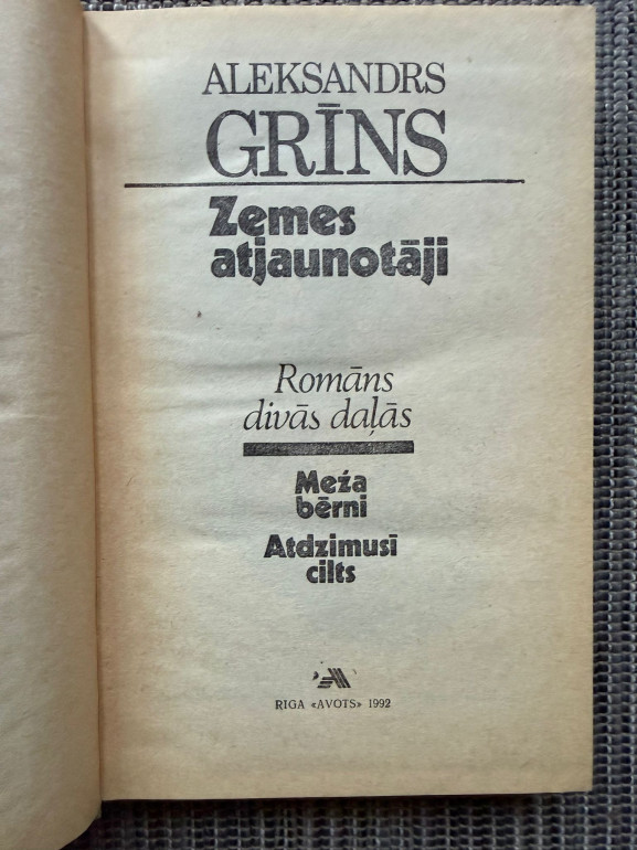 | Grāmata “Zemes atjaunotāji” (Aleksandrs Grīns, 1939) ir vēsturisks romāns divās daļās – “Meža bērni” un “Atdzimusī cilts”. Darbība aizsākas Sēlijā 16. gadsimtā un turpinās hercoga Jēkaba laikā. Romānā tēloti latviešu zemnieku dzimtu likteņi, uzsvērts darba tikums, dzimtenes mīlestība un varonība, savijot tos ar pasaules politiskajiem notikumiem, kauju un medību ainām. Tekstā ienāk latviešu etnogrā | |
