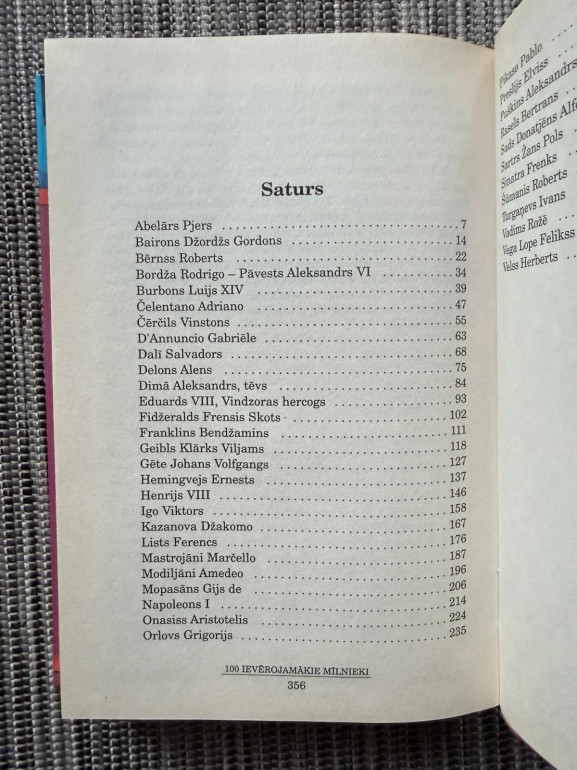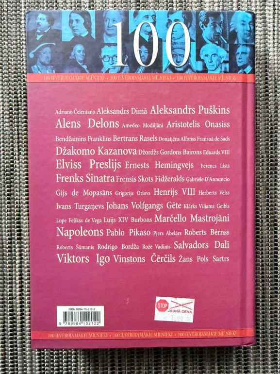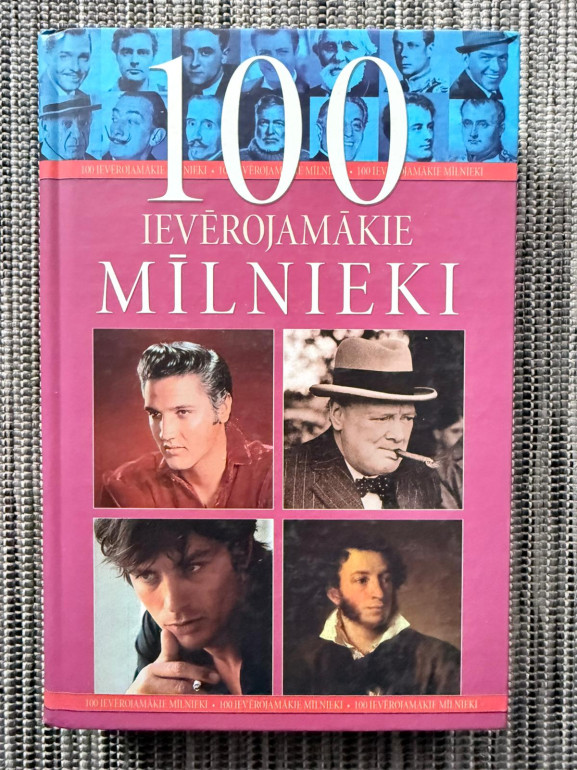 | Grāmata “100 ievērojamākie mīlnieki” ir populārzinātnisks krājums par 100 pasaules slavenībām un viņu mīlas stāstu peripetijām — no Čelentano, Dimā un Delona līdz Puškinam, Hemingvejam, Kazanovam, Sinatram, Napoleonam, Pikaso un Čērčilam. Uzsvars uz kaislībām, drāmām un romantiku; sastādītājs Edvīns Spriņģis | |