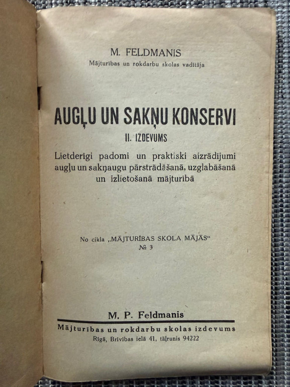 | Grāmata “Augļu un sakņu konservi” (M. P. Feldmanis, 2. izdevums, 1933) ir praktisks ceļvedis mājturībā par augļu un sakņaugu pārstrādi, uzglabāšanu un izmantošanu. Tajā sniegti lietderīgi padomi un receptes konservu gatavošanai, sterilizēšanai un pārtikas tehnoloģijai. Apjoms – 72 lpp., izdevējs M. P. Feldmanis mājturības un rokdarbu skola. | |