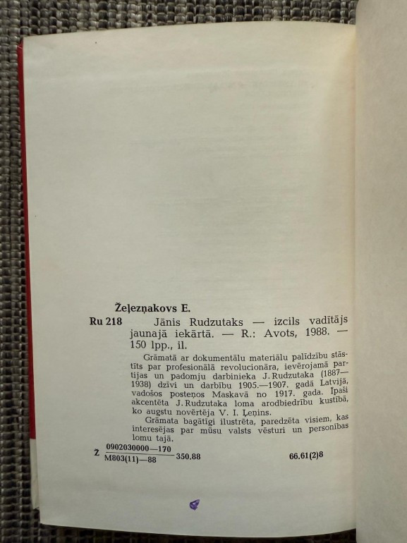 | “Jānis Rudzutaks – izcils vadītājs jaunajā iekārtā” (Eduards Žeļezņakovs) ir biogrāfija par latviešu revolucionāru un padomju politiķi Jāni Rudzutaku. Grāmata atklāj viņa dzīves ceļu, nozīmīgākos notikumus un lomu komunistiskajā režīmā, papildināta ar fotogrāfijām un dokumentāliem materiāliem. | |