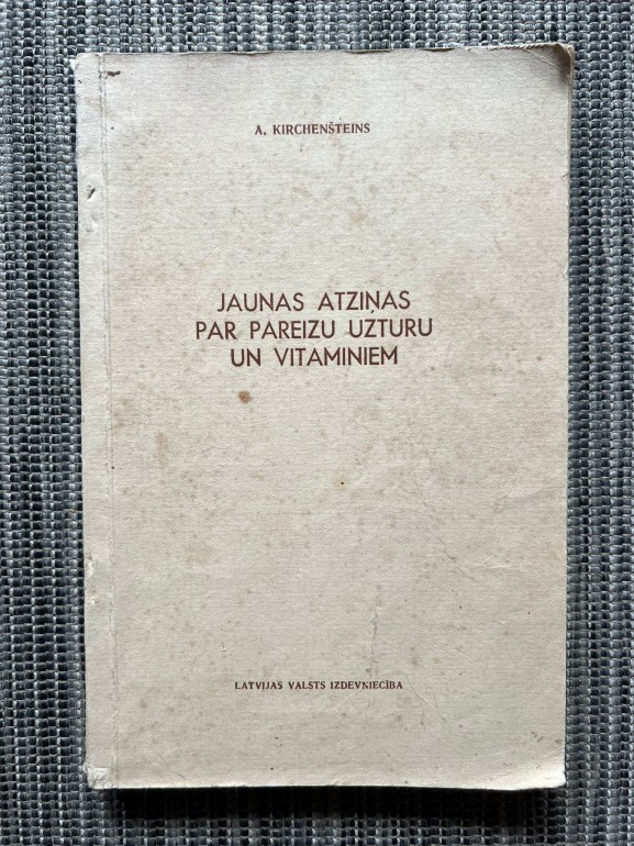 | Grāmata “Jaunas atziņas par pareizu uzturu un vitamīniem” (Augusts Kirhenšteins, 1954) ir populārzinātnisks darbs par veselīgu uzturu un vitamīnu nozīmi cilvēka organismā. Autors, ievērojams mikrobiologs, skaidro uzturvielu lomu, sniedz ieteikumus sabalansētai ēdienkartei un uzsver zinātniski pamatotu pieeju veselības saglabāšanai. Apjoms – ap 218 lpp., izdevējs Latvijas Valsts izdevniecība. | |