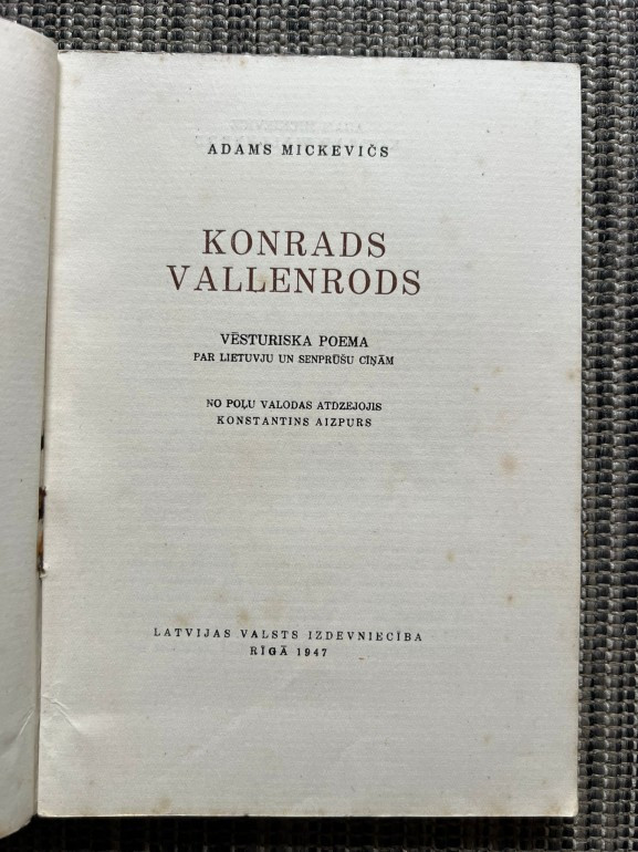 | Grāmata “Konrāds Vallenrods” (Adams Mickevičs, 1828; latviski izdota 1947) ir vēsturiska poēma par lietuviešu un prūšu cīņām pret Vācu ordeņa bruņiniekiem. Darbs caur galvenā varoņa iekšējo drāmu atklāj patriotisma, nodevības un morāles konfliktus, uzdodot jautājumu par tautas brīvības cenu. [www.ibook.lv] | |