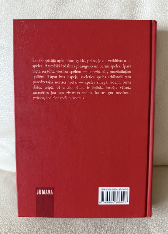 Enciklopēdijā apkopotas galda, prāta, joku, veiklības u.c. spēles. Atsevišķi izdalītas pieaugušo un bērnu spēles. Īpaša vieta ierādīta viesību spēlēm – iepazīšanās, muzikālajām spēlēm. Tāpat būs iespēja izvēlēties spēles atbilstoši paredzētajai norises vietai – sniegā, ūdenī, brīvā dabā, telpā. Šī enciklopēdija ir lieliska iespēja vēlreiz atcerēties jau sen zināmās spēles | |