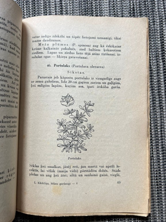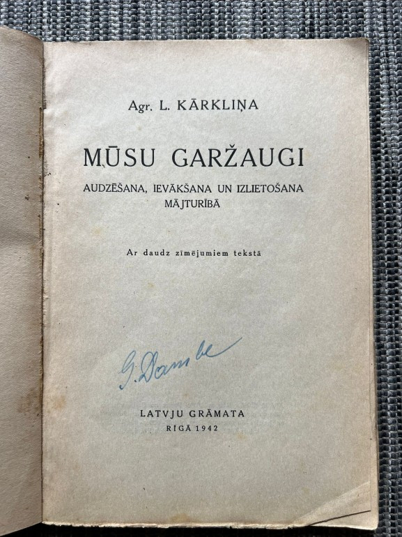 | Grāmata “Mūsu garžaugi” (Agr. L. Kārkliņa, 1942) ir praktisks ceļvedis par garšaugu audzēšanu, ievākšanu un izmantošanu mājsaimniecībā. Tajā sniegti padomi, kā pareizi kopt un lietot dažādus garšaugus ikdienas ēdienu garšas uzlabošanai. Apjoms – ap 85 lpp., izdevējs Latvju Grāmata | |