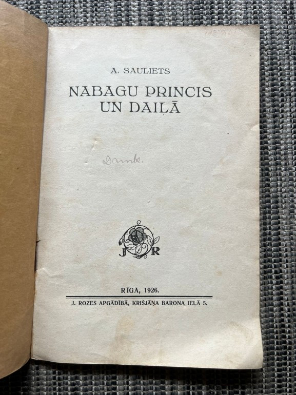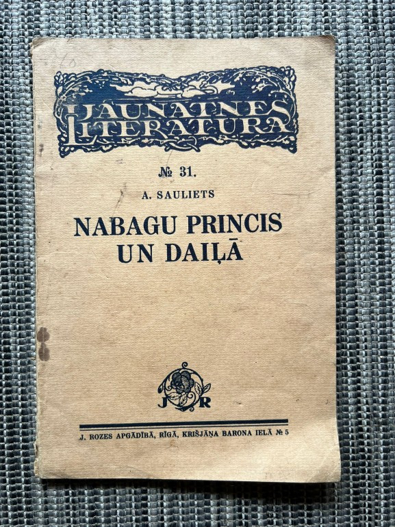 | Grāmata “Nabagu princis un Daiļā” (Augusts Saulietis, pirmpublicējums 1906, izdevums 1926) ir stāsts, kas pieder pie autora simbolisma un reālisma sintēzes darbiem. Tajā raksturīgi simbolistiski tēli, dabas tēlojumi un mistikas noskaņa, kas caur romantisku sižetu atklāj cilvēka jūtu pasauli un ideālu meklējumus. Darbs ir daļa no Saulieša prozas krājumiem, izdots Jāņa Rozes apgādā. | |