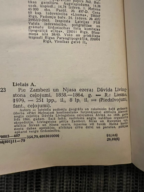 Livingstona ekspedīcijas 1858–1864. gadā. Pētījumi par Zambezi, Njasa un Sires upēm, afrikāņu cilšu dzīvi un cīņa pret vergu tirdzniecību. Turpinājums iepriekšējai grāmatai. [www.goodreads.com] | |