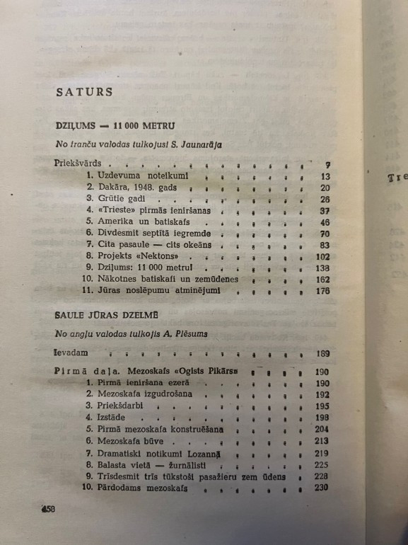 Grāmata “Saule jūras dzelmē” (Žaks Pikārs, 1979) ir dokumentāls stāsts par dziļūdens pētniecību, batiskafa “Trieste” ekspedīcijām un cilvēka ceļu uz okeāna visdziļākajiem punktiem. Pikārs dalās pieredzē par zemūdens pasaules izzināšanu, zinātniskajiem atklājumiem un izaicinājumiem, kas saistīti ar dzīvi ekstremālos apstākļos. | |
