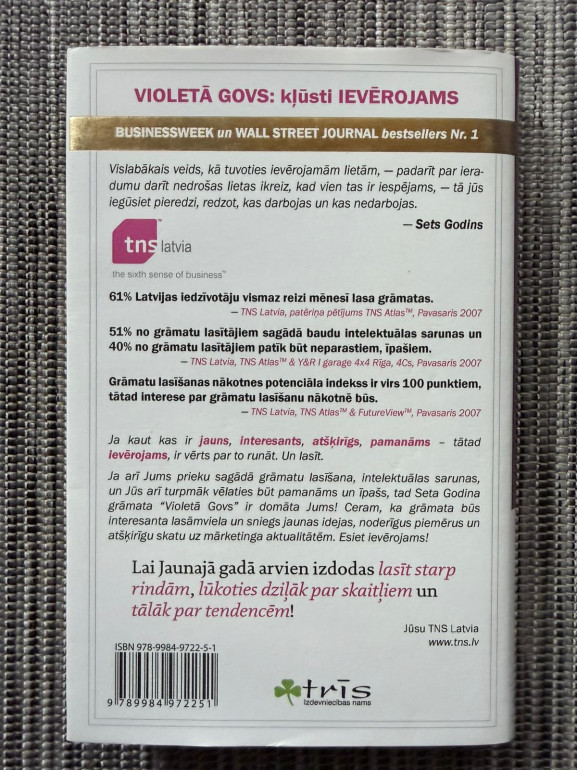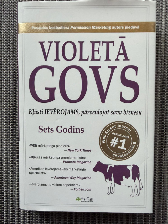 | Grāmata “Violetā govs” ir Seta Godina mārketinga manifests par izcelšanos pārpildītā tirgū. Tās galvenā ideja: radiet tik izcilu, atšķirīgu produktu, lai cilvēki par to gribētu runāt. Praktiski piemēri un padomi, kā atteikties no viduvējības un veidot “remarkable” piedāvājumu. | |